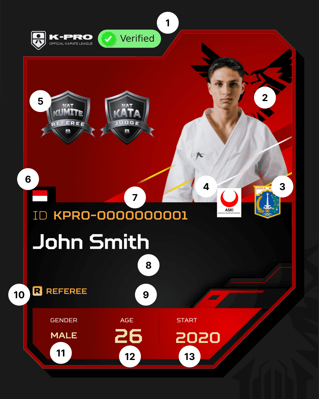 K-PRO Membership Cards are identification cards that indicate that the corresponding athlete, coach, referee, and official is recognized by K-PRO as a professional in the karate sport.
